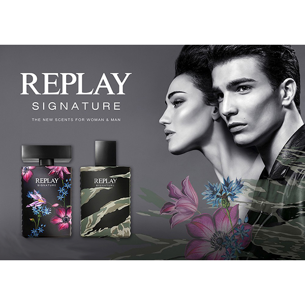 Signature от Replay е дървесно-пикантен аромат за мъже. Replay Signature стартира през 2017 г. Връхни нотки са канела, розов пипер и бергамот; средни нотки са кедър, индийско орехче, роза, здравец и мента; Базовата нотка е скъпоценни дърва.